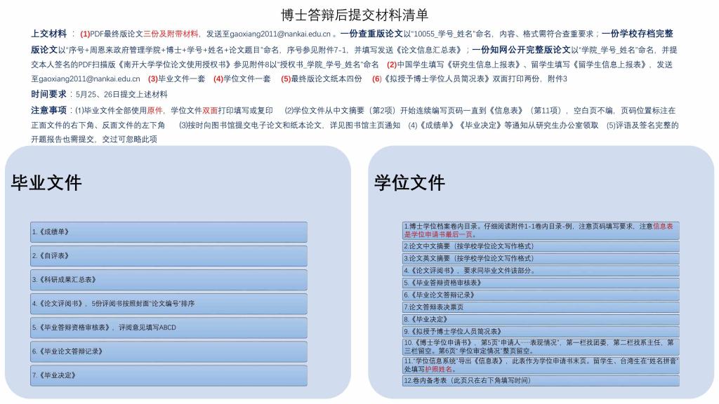 博士答辩通过后需要及时准备各种毕业及申请学位的材料,需要提交的材料清单如下: