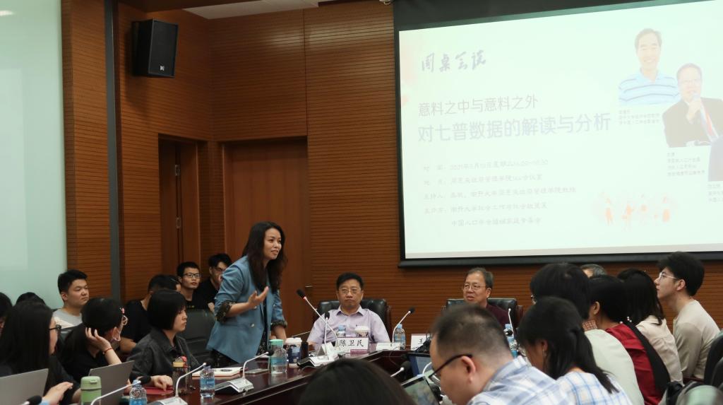 经济学院教授、中国人口学会常务理事陈卫民与原国家流动人口司司长王谦三位专家莅临现场,社会工作与社会政策系教授、中国人口学会理事吴帆担任主持人。诸位专家就七普数据中的热点议题与参会师生进行了分享和交流。
