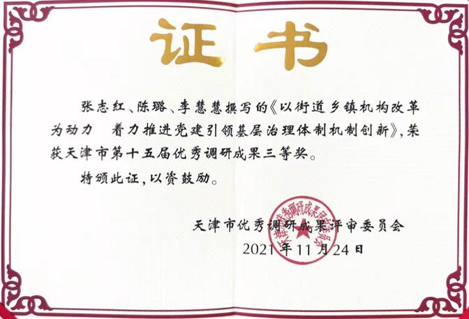 副教授、中国政府发展联合研究中心研究员张志红牵头撰写的调研报告荣获优秀调研成果三等奖。据悉,天津市优秀调研成果奖由中共天津市委研究室设立,旨在奖励对促进经济社会发展具有重要指导作用和参考价值的决策咨询性报告、建议以及具有可行性研究方案。
