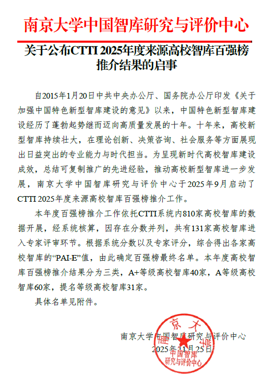 中国政府发展联合研究中心位列其中,成功入选CTTI 2025年度高校智库百强榜,也是91国产