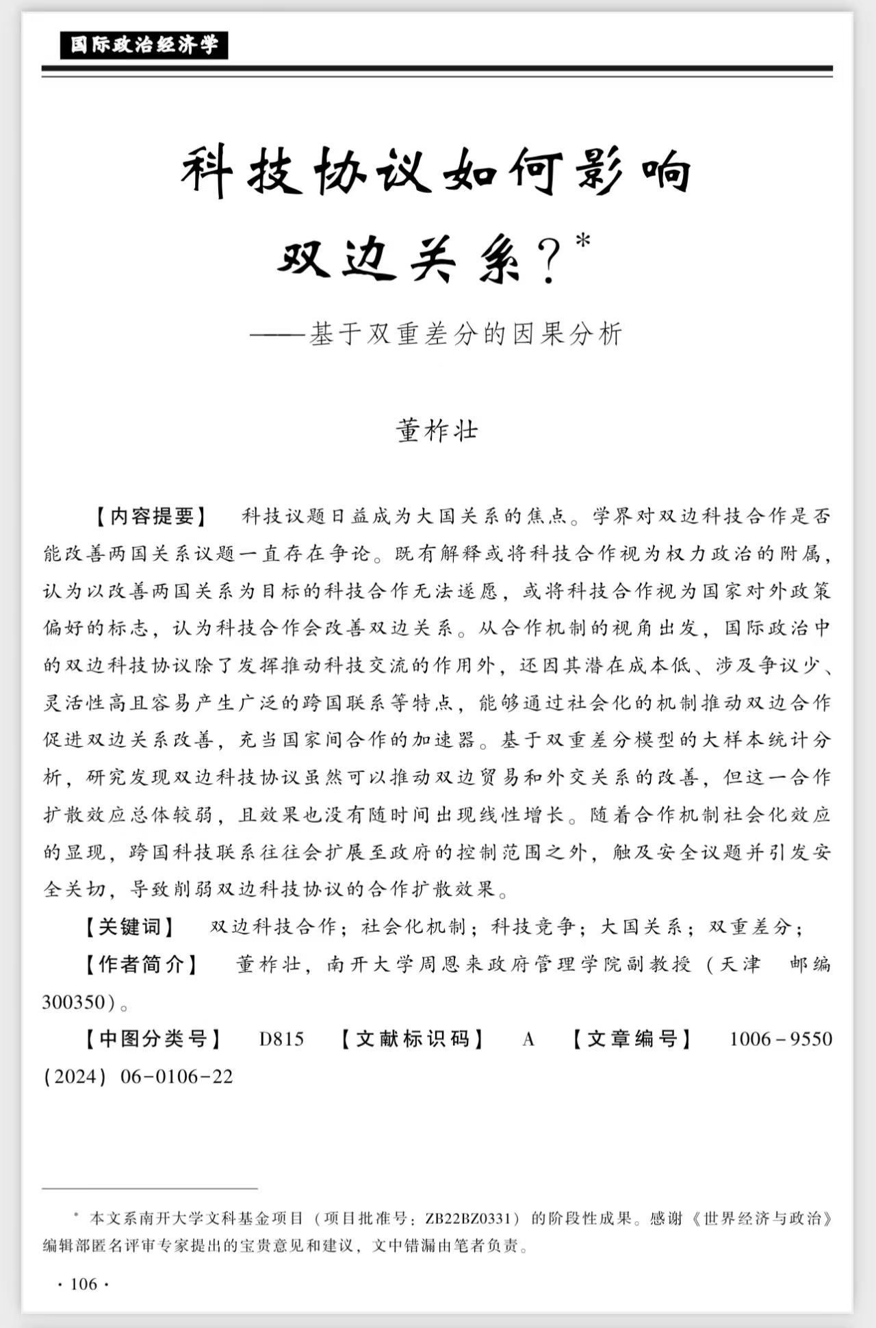91国产 董柞壮副教授在2024年第6期的《世界经济与政治》发表文章《科技协议如何影响双边关系——基于双重差分的因果分析》。文章从科技合作这一焦点议题出发,基于合作机制视角,利用双重差分模型的大样本统计,分析科技协议对双边关系的影响。文章指出双边科技协议对双边关系的改善短期内有一定效果,但随着合作机制社会化效应的显现,跨国科技联系往往会引发安全关切,进而削弱双边科技协议的合作扩散效果。