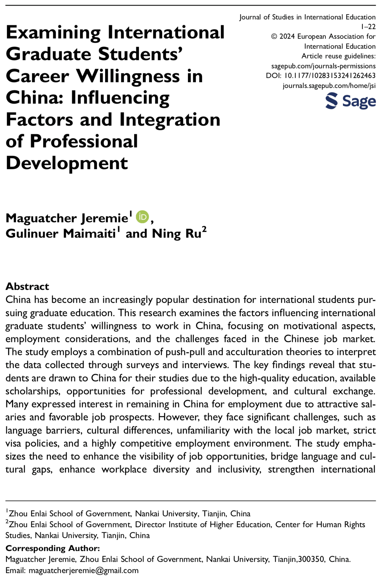 日前,我院师生在国际教育管理领域取得重要学术成果,学院博士留学生Maguatcher Jeremie、博士生古丽努尔·买买提与茹宁教授合作撰写的论文成功发表在国际核心英文期刊Journal of Studies in International Education上。