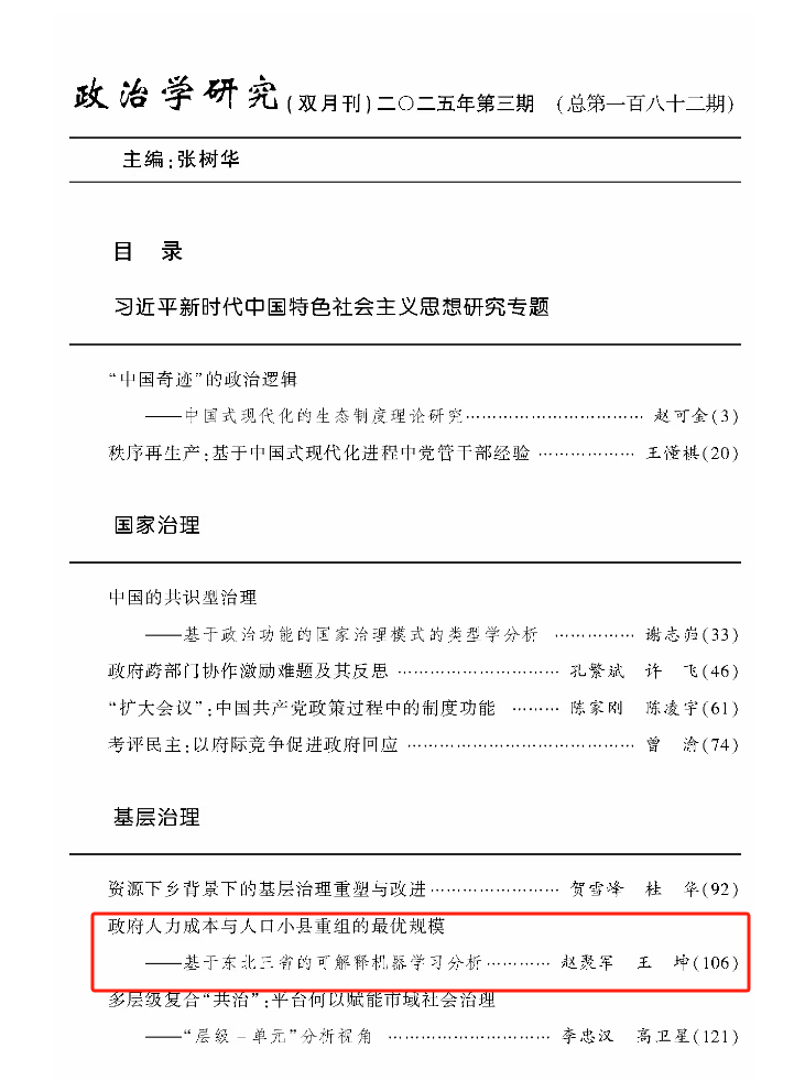 中国政府发展联合研究中心研究助理王坤撰写的《政府人力成本与人口小县重组的最优规模——基于东北三省的可解释机器学习分析》一文获得发表。