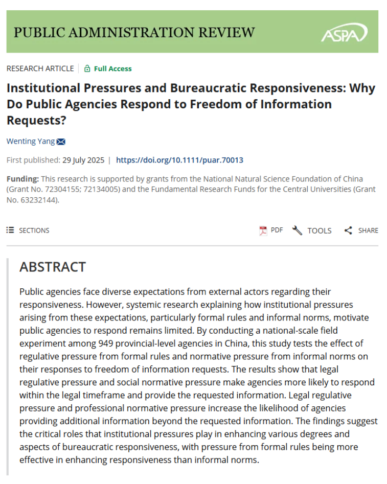 杨文婷老师的独著论文“Institutional Pressures and Bureaucratic Responsiveness: Why Do Public Agencies Respond to Freedom of Information Requests? ”(《制度压力与官僚回应:公共部门为何回应信息公开申请?》)被公共管理国际顶级期刊Public Administration Review(PAR)录用并在线发表。PAR创刊于1940年,五年平均影响因子为7.3,在90本公共管理国际期刊中排名第一,是公共管理领域最负盛名的学术期刊之一。