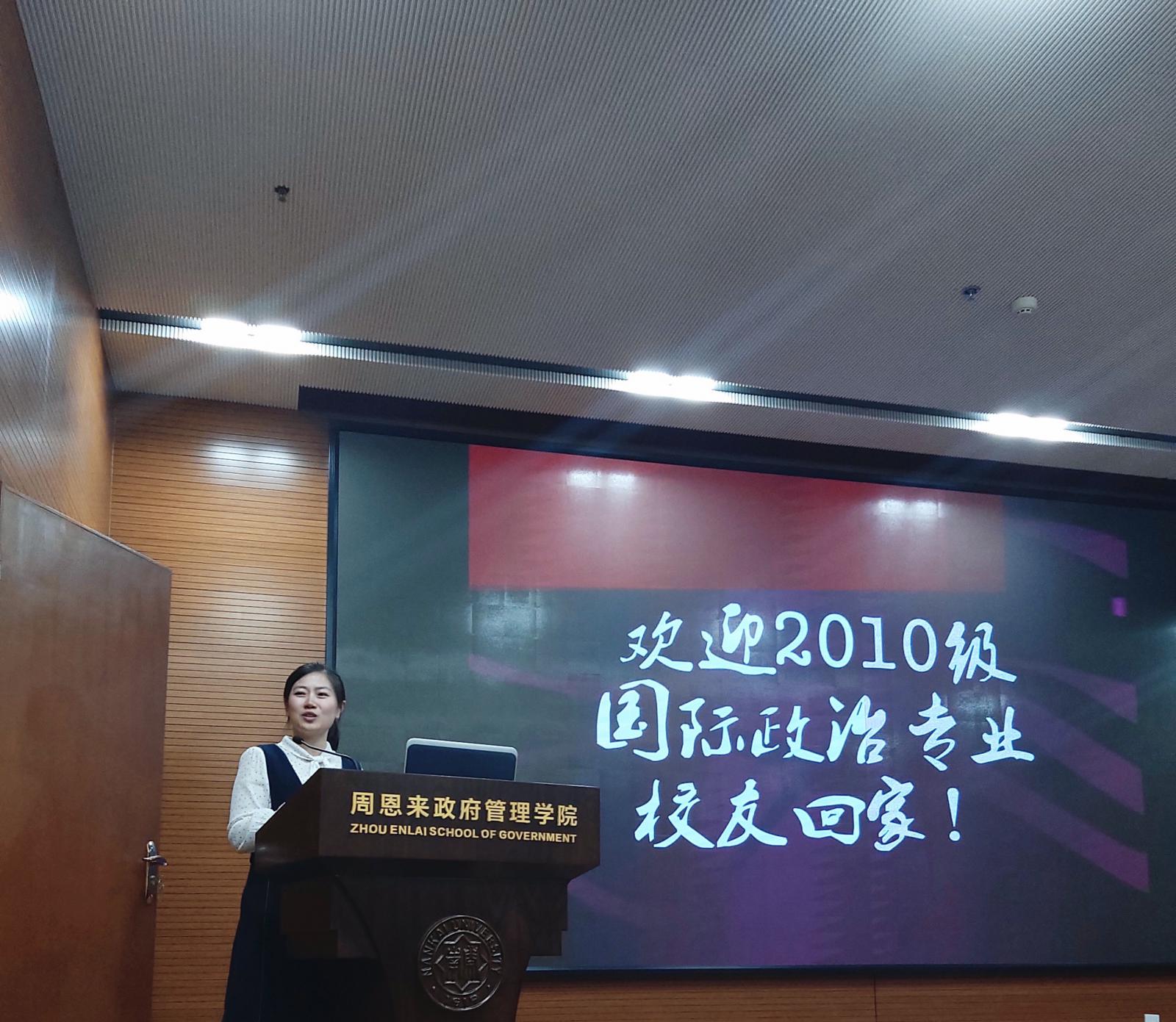 (通讯员:王燕 张雪娇)百年南开,公能日新,砥砺奋进。在百年校庆之际,来自五湖四海、各行各业的南开学子回到母校的怀抱为南开庆生。政府学院2010级国际政治专业校友的也从世界各地返回政府学院,在此欢聚一堂,共同感受母校的进步,回忆美好的南开时光。其中一个特别的环节勾起了在座校友的美好回忆,那就是重温入学时的恩来精神展演活动。