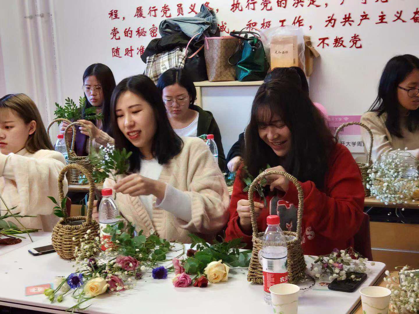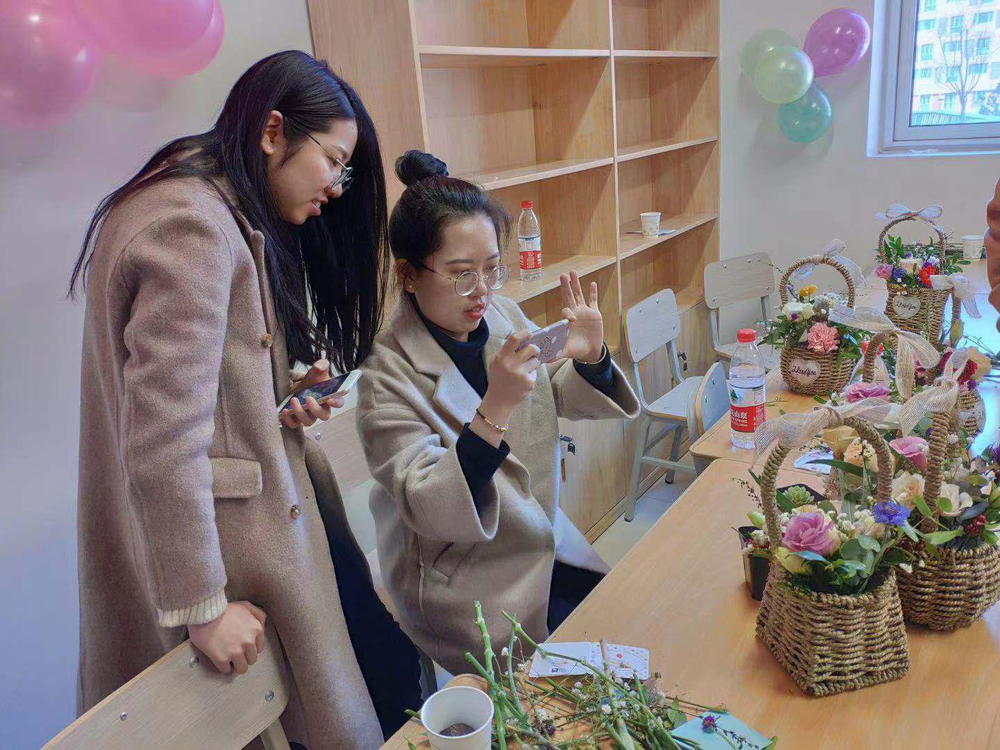 津南校区2B宿舍党团活动室,通过花艺体验,展示了当代女大学生的知性美,提升了对美好生活的向往,并且通过插花作品义卖的形式,积极播撒爱心,践行雷锋精神。