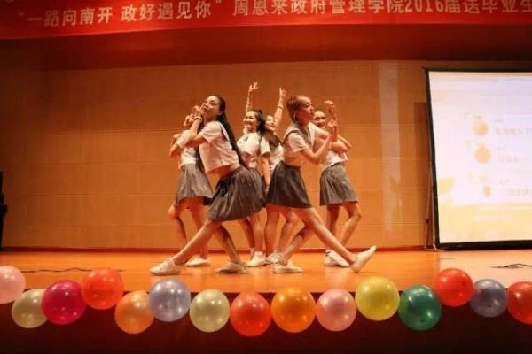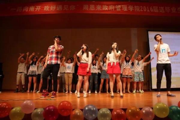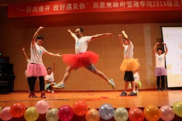 第二个节目来自12级行政管理的同学。一首一生有你,婉转悠扬,道出了青春的迷惘与执著,青春的感动留在大家心中。第三出场的是刘书冰同学,她带来傣族舞蹈彩云之南,傣家姑娘的曼妙身姿仿佛把我们带到了湿热的云南。接下来是冯晓璇,丁盛楠,陈晨,房懿同学合唱的小幸运,默契的眼神与有魅力的和音让观众席气氛十分热烈。紧接着鸿迪孜同学身着白色民族裙装带来的民族舞蹈天鹅,利落的动作让我们看到了哈萨克族别样的民族风情。12级社会的同学们给我们带来南开学子原创歌曲,南开 秋天,歌声仿佛把南开秋天金黄的落叶和当初入学的悸动都带到了现场。下一个节目是12级国际政治班的靓丽女生的韩舞串烧,热辣的舞姿把现场气氛火速提升。12级应用心理的女生带来舞蹈怦然心动,独特的清纯魅力和有力的动作形成反差,给大家带来极佳视听享受。12级行政管理男生们带来不可描述的舞蹈。揉合了千手观音,四小天鹅,小鸡小鸡等耳熟能详的舞蹈,活泼的动作将现场气氛推入高潮。中场互动环节,国际关系系主任韩召颖与毕业生们一起进行接力式你划我猜游戏,生动有趣。田拓与朱功伟带来的相声《我要毕业》细数四年大学生活,以幽默风趣的方式给毕业画下一个完美的句号。12级社会工作专业毕业生带来的《辉夜城之舞》将晚会推向高潮,欢呼声不断。12级国际政治的一曲《尚好的青春》唱出了多少毕业不舍,但无论怎样,还是要笑着说一句,毕业快乐!
