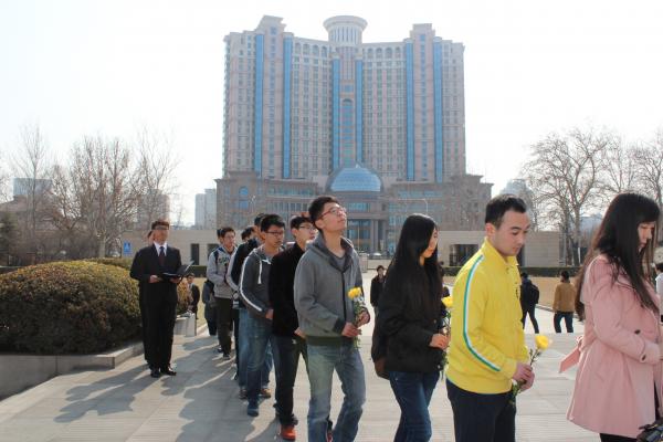 为了表达对总理的崇敬和哀思,广大师生面对总理像三鞠躬,依次献上鲜花,并庄严地举起右手立下誓言:为中华之崛起而读书,为实现自己的理想不懈努力,为实现伟大的中国梦不懈奋斗!