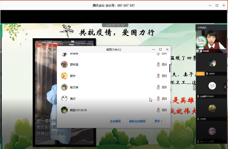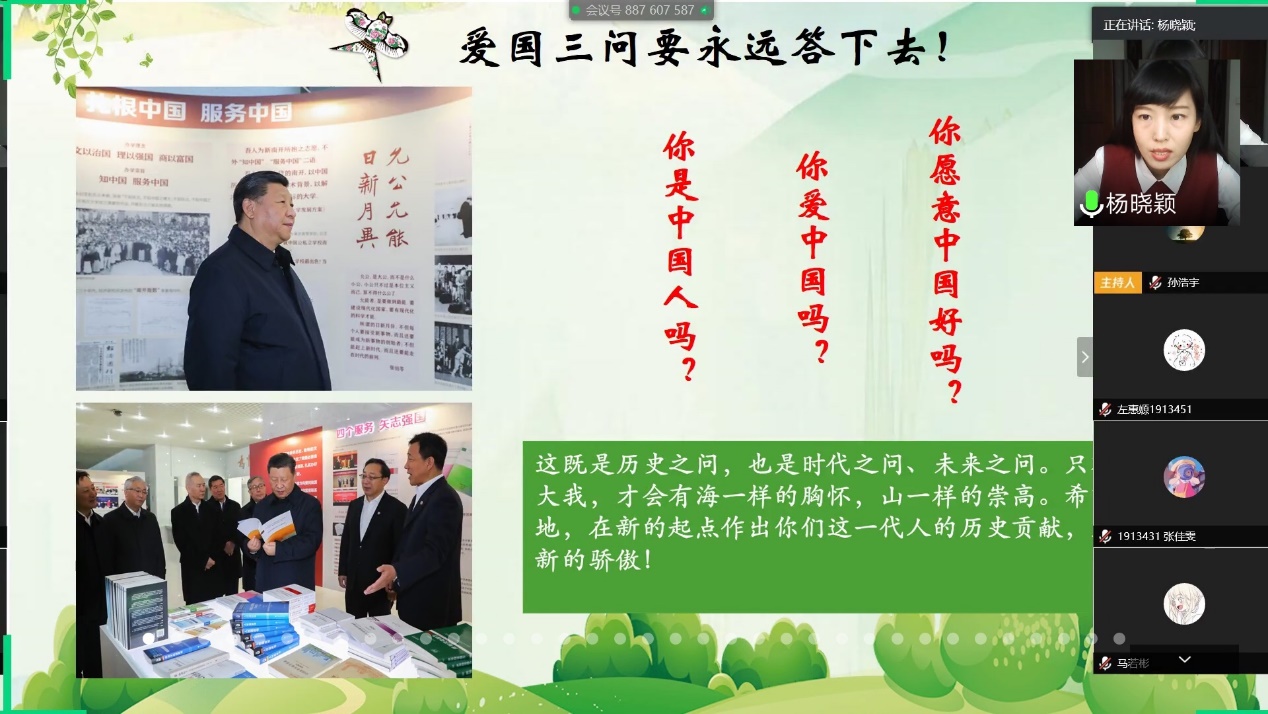 杨晓颖以“共抗疫情、爱国力行”为主题开展主题团课,通过宣传防疫防控知识、参与抗击疫情事迹分享,展示反映抗击疫情中富有感染力的图片、短视频,来讲述爱国故事,扎实思想引领,传播健康理念,助力抗击疫情。“没有人生来就是英雄,总有人用平凡成就伟大!”杨晓颖结合南开学子在疫情期间的志愿服务故事,深情讲述着91国产