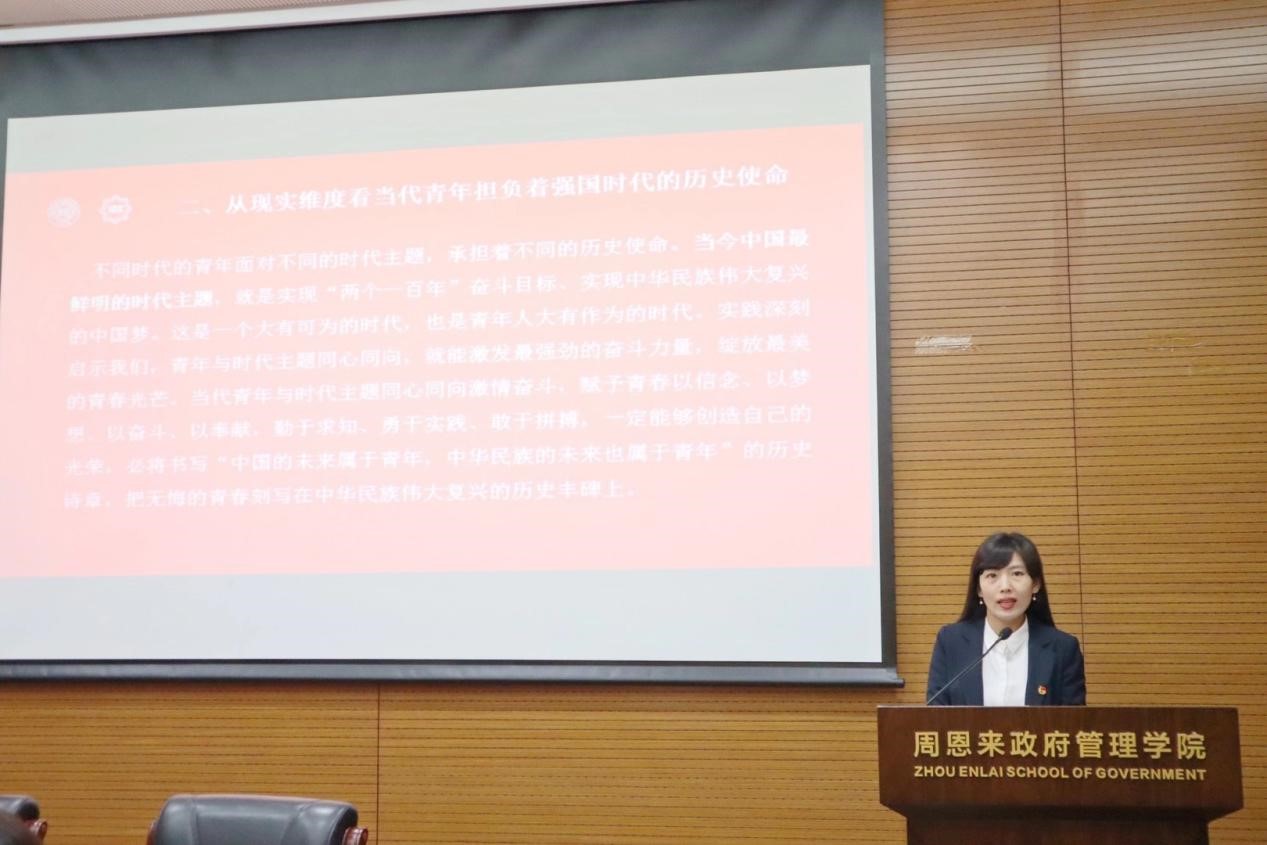 接下来,学院团委书记杨晓颖老师进行团课教育,为大家详细讲解了《习近平总书记关于青年和青年工作的重要论述》的核心要义,带领全体人员重温习近平总书记对南开师生、广大青年的讲话寄语,多维度、多层次地阐明了总书记的讲话精神,进一步明确总书记对青年坚定理想信念、加强文化修养、积极投身于新时代中国特色社会主义伟大实践的希冀,并对青年团干提出增强本领能力、做好青年引路人的殷切期望。