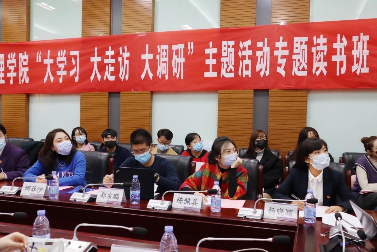 团委“大学习 大走访 大调研”主题活动专题读书班集中学习会议于院楼144会议室正式召开。学院团委书记、研究生辅导员杨晓颖老师,学院团委副书记、2017级本科生辅导员陈佩其老师,学院团委副书记、2018级本科生辅导员郑宗鹏老师,2019级本科生辅导员娜菲沙老师,2020级本科生辅导员东韡妍老师,学院团学骨干以及组织部工作人员出席了本次会议,东韡妍老师主持。