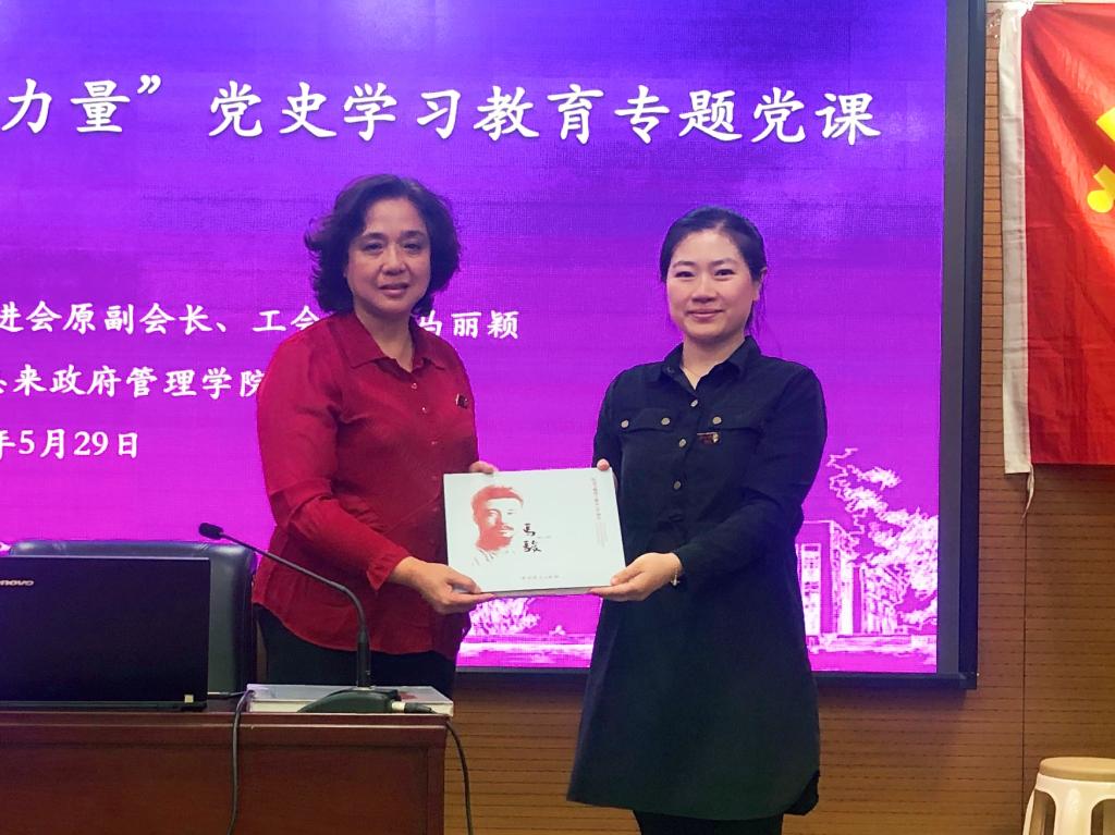 党课的最后马丽颖老师赠与政府学院师生《纪念马骏烈士诞辰120周年》纪念图书,勉励在场师生秉承马骏烈士遗志,以青春书写奋斗,以汗水浇灌事业,为中华民族的伟大复兴而努力奋斗。