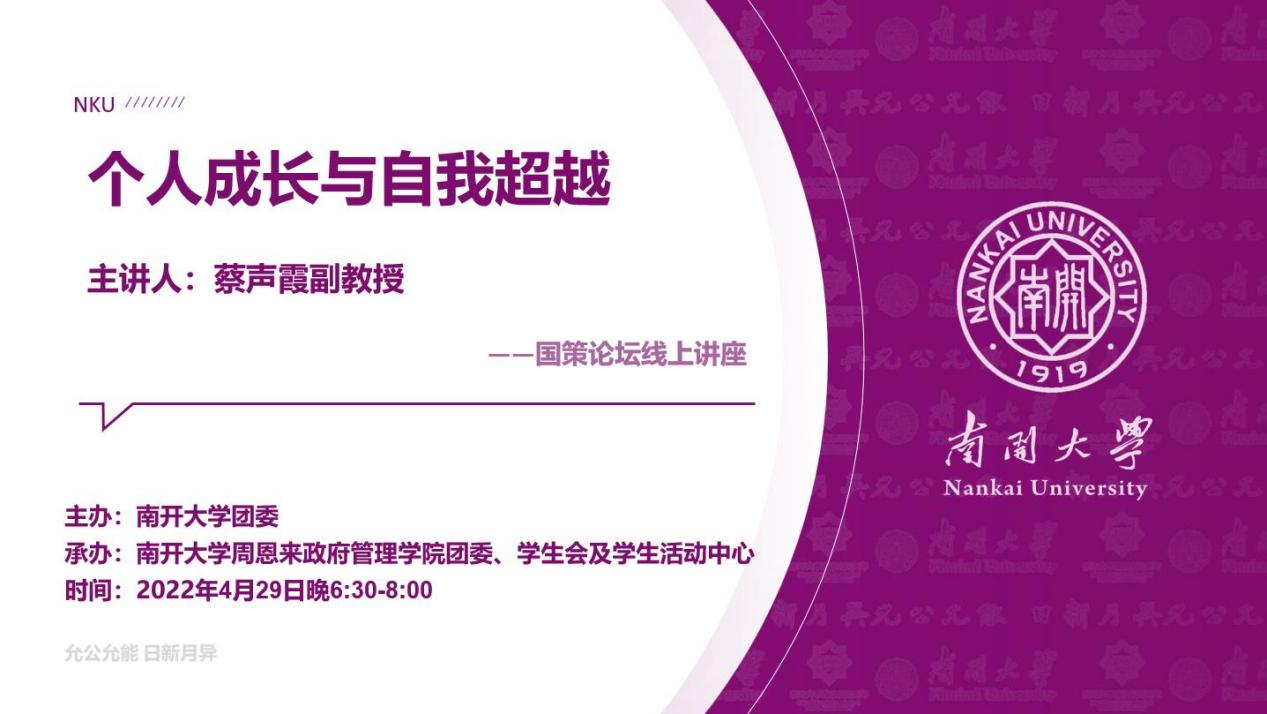 副教授、行政管理系主任蔡声霞老师作为主讲嘉宾。蔡老师围绕“个人成长与自我超越”的主题,就新时代大学生如何树立远大理想、实现自我超越的问题进行了充分阐述,并进一步从贴近生活的视角,指出同学们如何更加充分、全面地了解自己并正确处理人际关系。