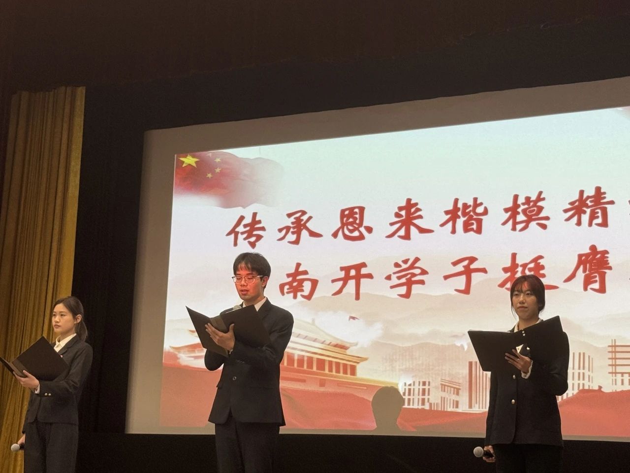 津南校区总理像前进行献花仪式,恩来精神展演团王国舟同学进行主持。