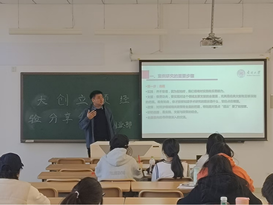 第六届校长杯优秀奖等。 他认为,大创选题可参考人文社科研究范式,如“政治沟通”“数字政府”;立项依据包括问题提出、文献综述和文献评价。文献综述要全面,寻找创新点和研究空白,基础研究可引用三分之一英文文献。同时他还提出立项书应包含项目实施方案、研究内容、研究设计、实施进度与预期成果等;在答辩时应注意项目书美观、控制时长、着装得体,以学习改进的心态从容应对老师提问。