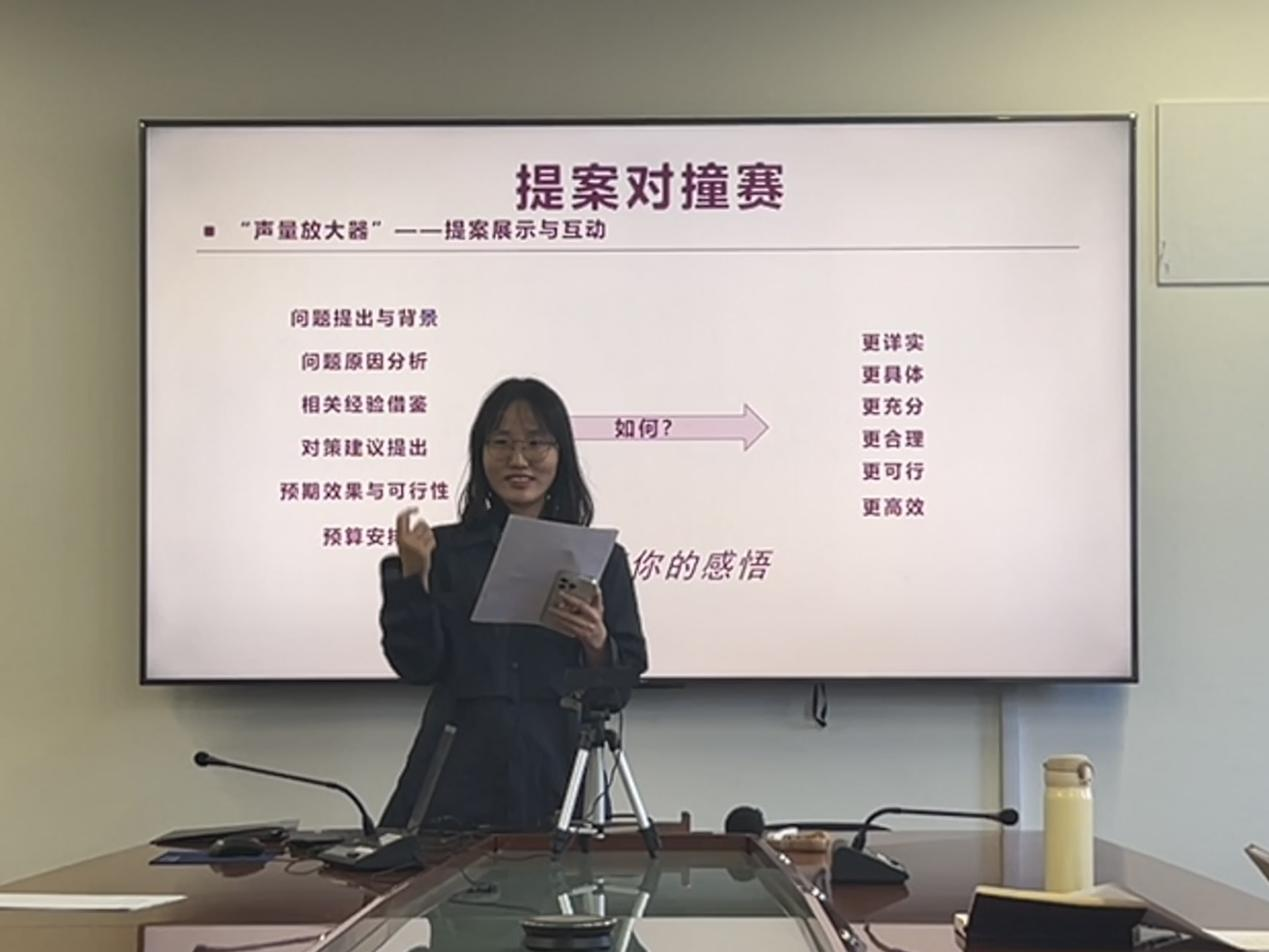 会议第三部分是充满活力与创意的“提案对撞赛”。参与者们自由组队,围绕教育教学、成长成才、生活服务、权益维护四大主题展开了探索思考。各个小组积极讨论、热烈交流,充分发挥团队智慧,构思提案内容。展示环节中,小组代表上台展示提案构思,现场气氛热烈,同学们积极提问、补充,形成了良好的互动交流氛围。
