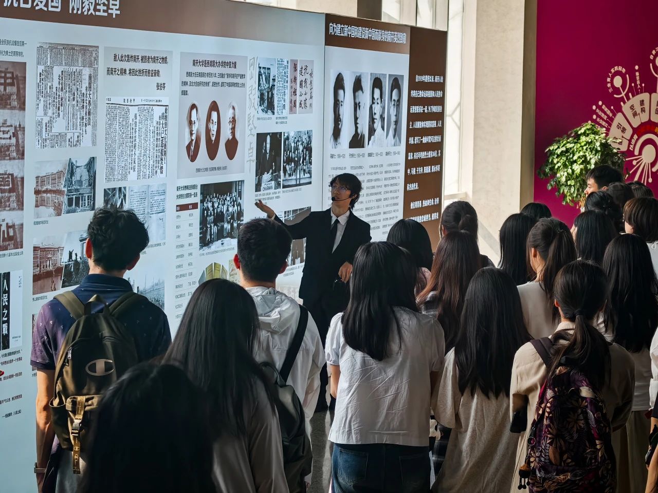 百年校史展览,共同追溯校史中的红色基因与学术脉络。展览以“允公允能,日新月异”校训为核心,通过珍贵史料展现学校在不同历史时期与党和国家发展同频共振的历程。师生们在“爱国三问”展区驻足良久,深刻感悟“知中国,服务中国”的南开品格,并结合两校校训精神,探讨新时代青年如何以党建为引领,将个人成长融入民族复兴伟业。