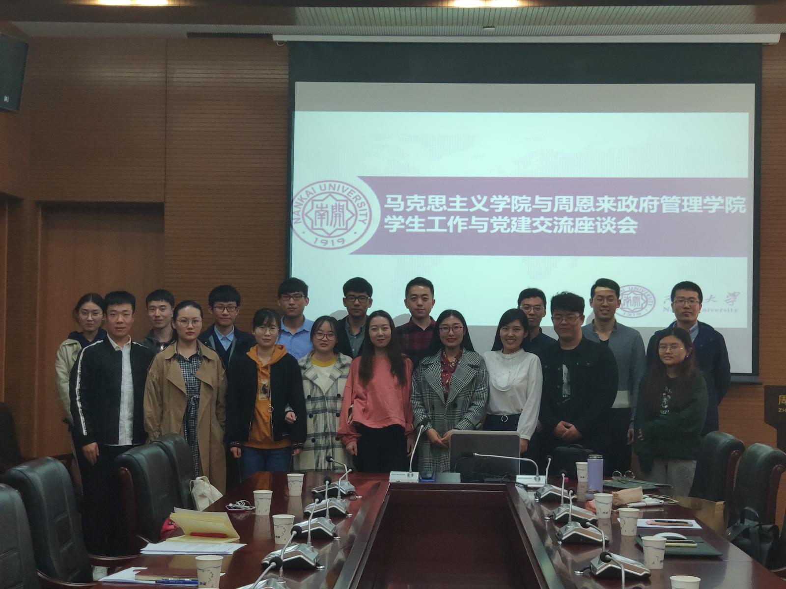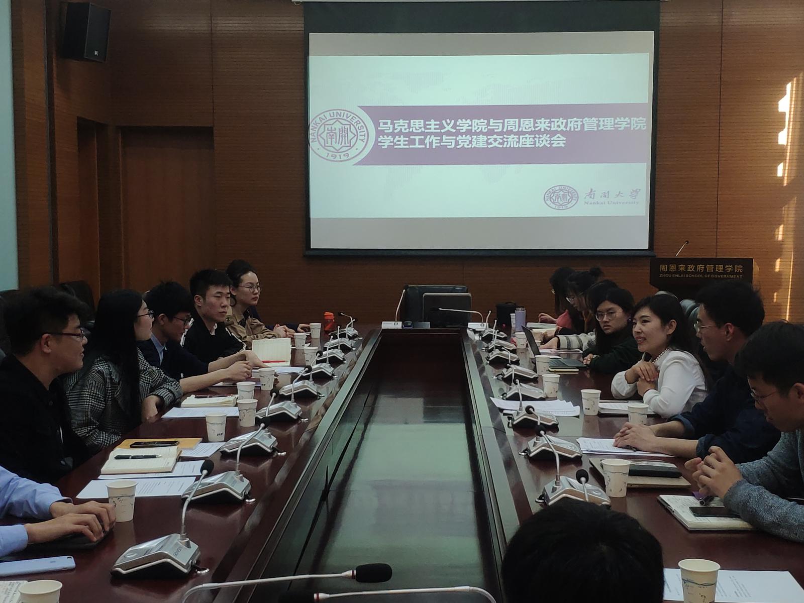 学生工作与党建交流座谈会于政府学院144会议室召开。出席本次座谈会的人员有马克思主义学院辅导员高田琪、组织员殴喜乐、研究生会主席郝津原及副主席5人、学院党支部书记2人;政府学院辅导员杨晓颖、研究生会主席武泽宇及副主席4人、硕士生党支部书记路晨磊、王政浩。本次座谈会围绕研究生会组织架构、活动开展以及党支部发展党员、联系群众、活动形式创新等相关话题进行了深入交流。