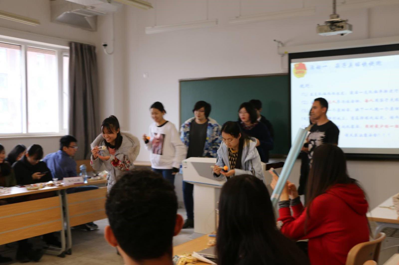 除此以外,支部还准备了文化交流环节,包括双语绕口令、团队活动、语言教学、文艺表演等,并抽签由两个团小组做了展示。教室里充满了欢声笑语。