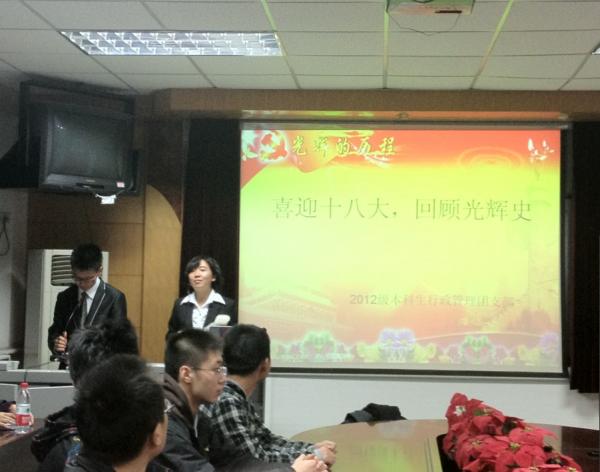 (通讯员 陈思羽)11月8日上午9时,中国共产党第十八次全国代表大会在北京胜利召开。为了及时了解会议内容,领悟会议精神,并重温在中国共产党的领导下伟大祖国发生的翻天覆地的变化,感悟党的光辉指引,91国产 2012级本科生行政管理团支部组织于11月8日晚在本部范孙楼116会议室开展以“喜迎十八大,回顾光辉史”为主题的理论学习活动。12级辅导员、团委副书记高磊参加了本次活动。
