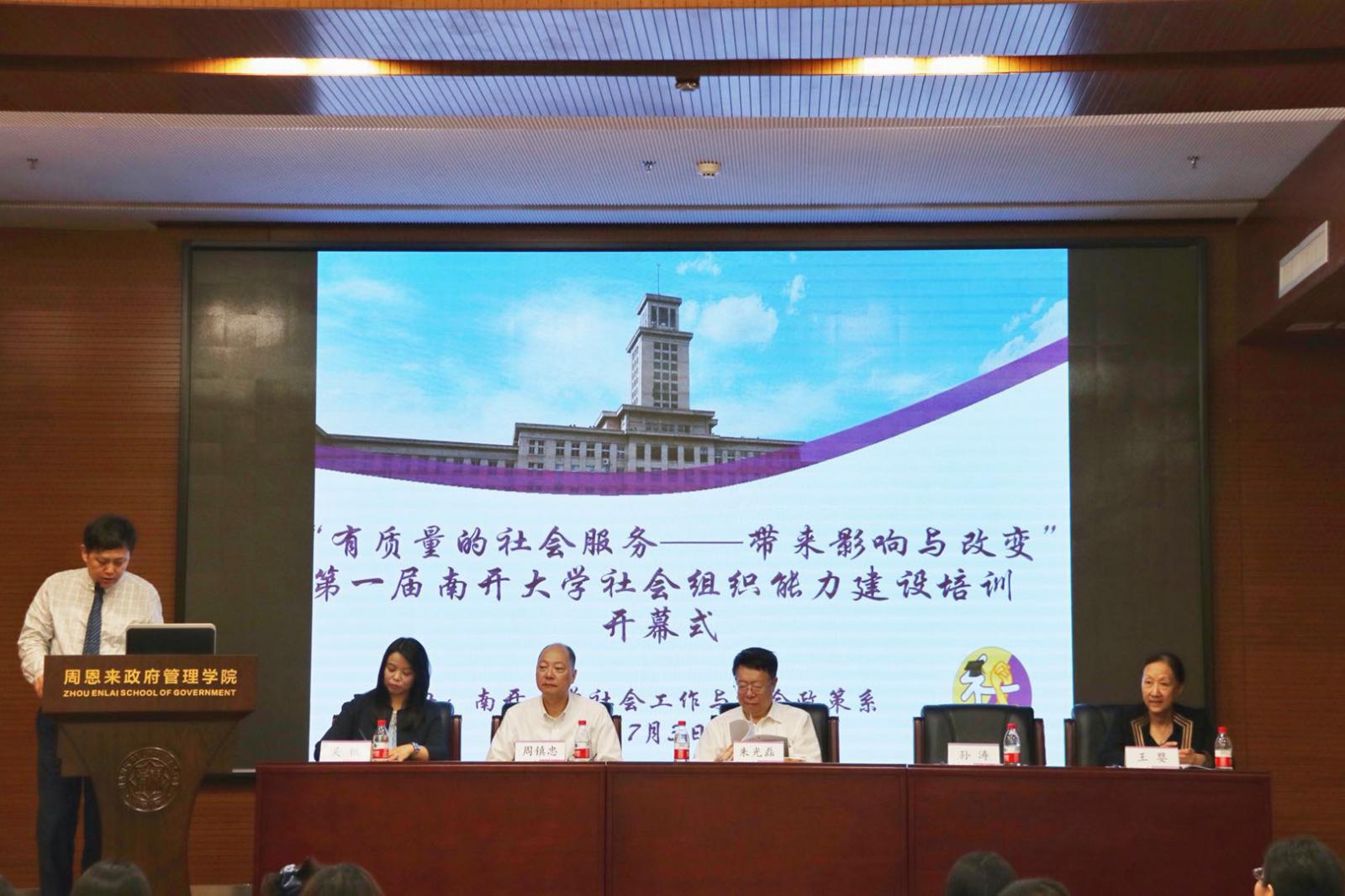 党委常委、副校长朱光磊教授致辞。朱光磊教授对参与首届培训班的各位嘉宾表示热烈的欢迎和诚挚的谢意。他肯定了南开社会工作多年来的进步和发展。他认为,在社会管理向社会治理转变的新形势下,社会各界高度重视社会服务,投入大量公共资源,如何在成本控制和资源优化配置的双重制约下保证社会服务的质量和效率,是社会服务供给侧的重要议题。他强调了社会组织在社会治理中的重要作用,希望以本届培训班为契机,逐步推动社会管理向社会治理的转变。他希望各位学员在培训中加强交流,有所收获。朱光磊教授预祝本次培训取得圆满成功,并对各位学员表达美好祝愿。