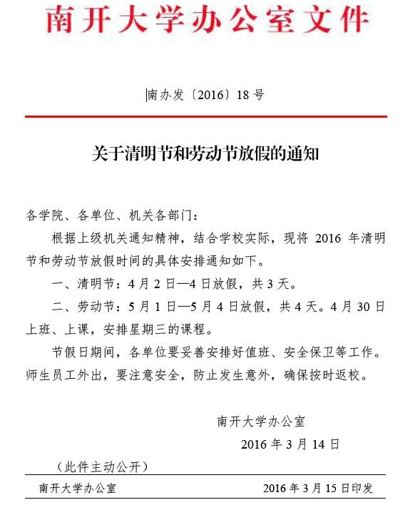 日前,学校公布了清明节和劳动节的放假安排,详见下图。需要提醒注意的是:4月30日,星期六,社会单位放假,但学校正常上班、上课,按周三作息。