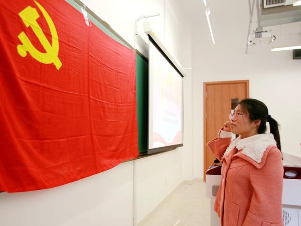 2013级本科生王娇面对党旗举起右拳,庄严宣誓,从这天起,她成为一名光荣的中国共产党员。