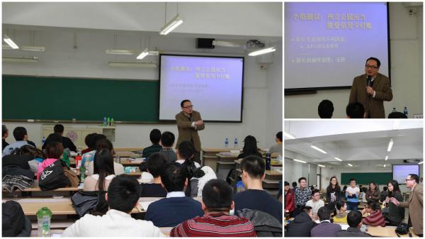 同时进行,主讲人为清华大学程文浩教授,程文浩教授曾先后毕业于北京大学和美国耶鲁大学,现为清华大学廉政与治理研究中心主任。本次案例示范教学也同时作为MPA全国教指委天津地区的师资培训活动,天津财经大学、天津师大、天津商大等高校的教师纷纷前来参加教学交流。课堂上,程文浩教授采用案例融合理论的讲述方式,为大家生动讲解了明尼苏达州的公共组织战略管理案例,提出公共管理能否有所作为要考虑公共价值、能力、支持三方面因素。随后,程教授又结合中国特色和大家共同分析爱国实业家卢作孚先生在1938年指挥的宜昌大转移案例。案例中充分表现了公共管理者的公共组织运营能力和爱国情怀,深深的感染了现场的老师和同学们,讲座现场不时爆发出热烈掌声。