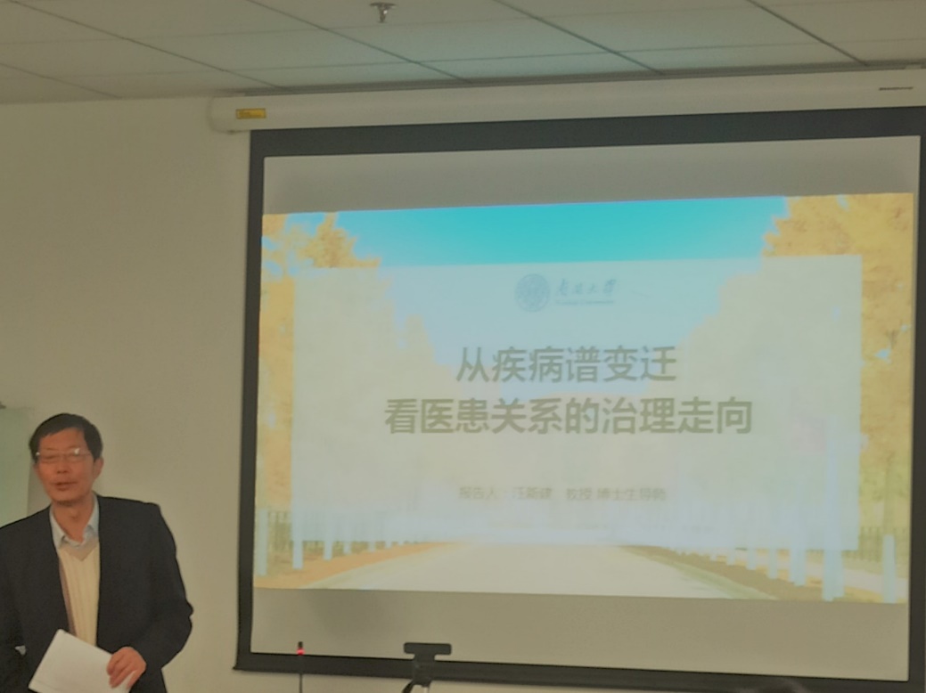 荣休教师汪新建教授以“从疾病谱变迁看医患关系的治理走向”为主题,分别从中国社会百年疾病谱变迁轨迹、疾病谱变迁对医患关系的影响、医患关系治理的未来趋势三个方面做了深入的阐释。
