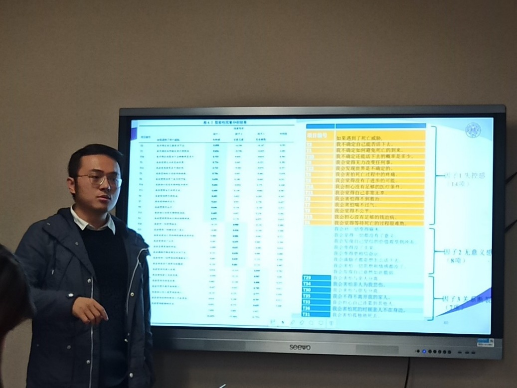 博士生孟祥寒探究了新冠疫情下中国人面对死亡威胁时的心理机制,发现中国人面临的死亡威胁体现在控制感丧失、关系断裂以及意义危机三个方面,权力感、依恋焦虑和生命意义感三者与死亡焦虑均通过无法忍受不确定性中介,不确定性比死亡威胁更易引发现实中的世界观防御,并且编制了中国版的“死亡威胁量表”,测量个体在面对死亡威胁时心理不同维度受影响的程度。