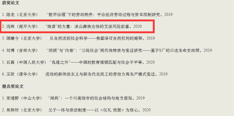 2021年10月,按照《余天休社会学优秀博士论文奖章程》规定的程序,终审评委经过认真的审阅和集中讨论,最终投票选出本届余天休奖的6篇获奖论文及2篇提名奖论文。其中,我院社会学系助理研究员冯琳博士的《“她者”的力量:凉山彝族女性的艾滋风险叙事》荣获优秀博士论文奖。