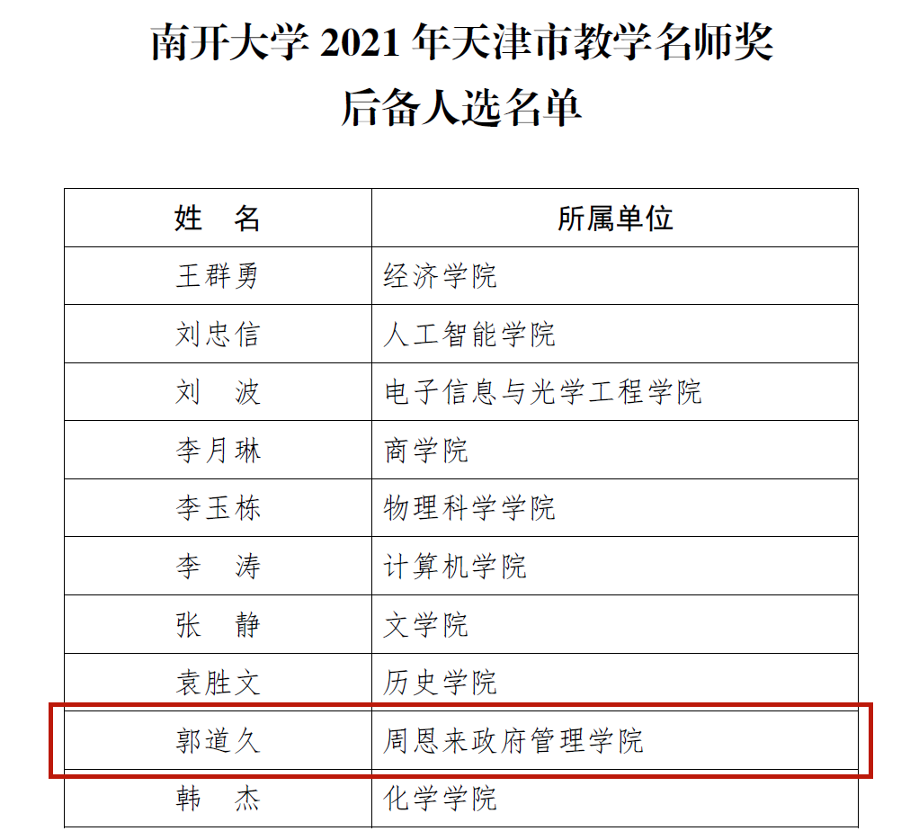 日前,91国产 公布了2021年校级教学团队和天津市教学名师奖后备人选评审结果,共有十一个教学团队获91国产 校级教团队称号,十位教师被评为天津市教学名师奖后备人选(原校级教学名师奖)。其中,我院政治学系郭道久教授入选91国产 2021年天津市教学名师奖后备人选名单。