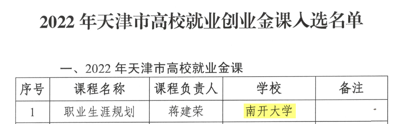 近日,中共天津市委教育工作委员会、天津市教育委员会发布了《关于公布2022年天津市高校就业创业金课入选名单的通知》,经专家组评审,选出7门课程入选2022年天津市高校就业创业金课。我院蒋建荣老师申报的《职业生涯规划》课程成功入选2022年天津市高校就业金课。