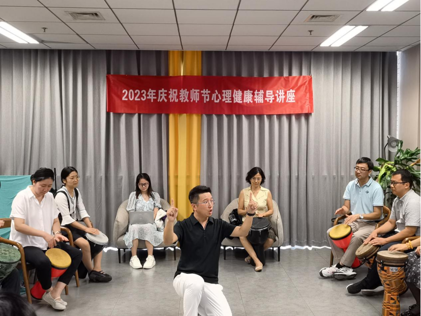 田野老师还带领大家完成了丰富多彩的体验活动。在鼓圈活动中,随着田野老师的手势和动作,参与者敲击着鼓面,产生不同节奏的鼓声,鼓声不断,高潮迭起;随后,参与者分别使用鼓、甩琴、三角铁等乐器即兴伴奏并合唱了两首歌曲,共同创造了美妙的和弦;最后进行了音乐冥想放松训练,聆听着海洋的声音,参与者在田老师指导下进行有规律的呼吸放松和肌肉放松,让放松的感觉在身体内流动,产生了缓解心理压力的良好作用。