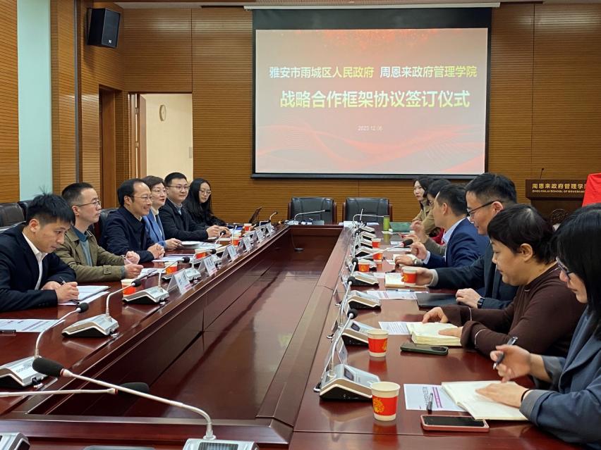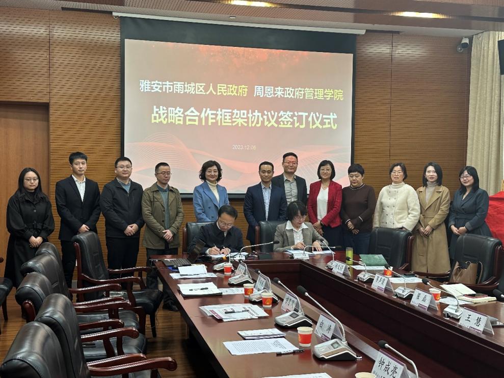 王慧书记首先对雨城区党政代表团表示热烈欢迎并感谢雨城区各级领导对于此项工作的支持与付出,希望以此次签约合作为契机与雅安市雨城区开展长期紧密的合作,助力产学研结合和人才培养等方面的广泛交流,充分发挥我院在政治学、公共管理等专业领域的优势和智库理论创新,整合高层次专业人才,搭建高能级的服务平台,贡献高水平的咨询成果,为雨城区重要政策决策和全局性问题提供高端的智力支撑,实现双方的互利共赢。