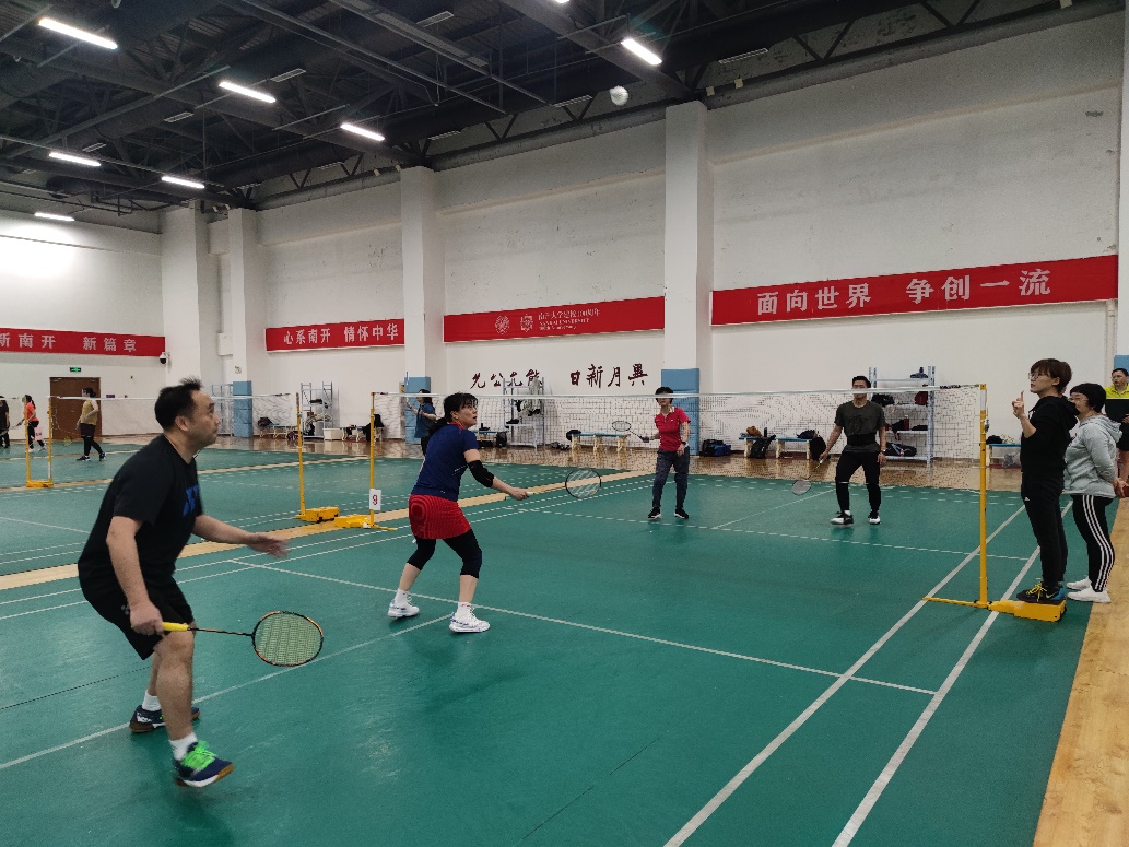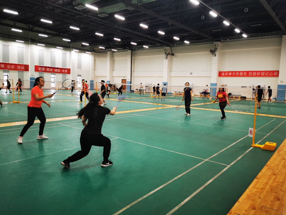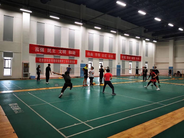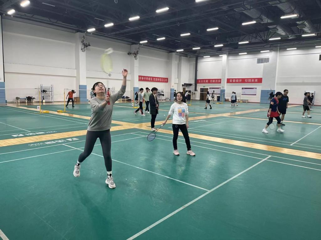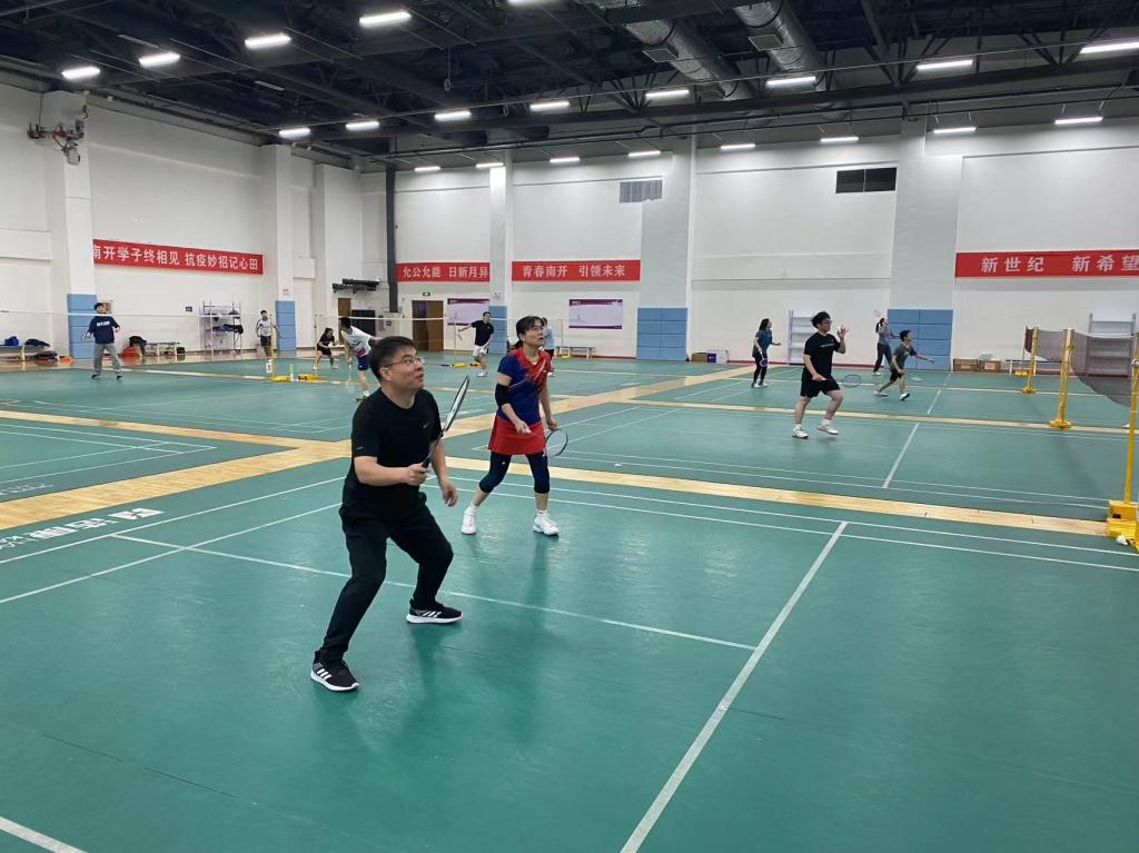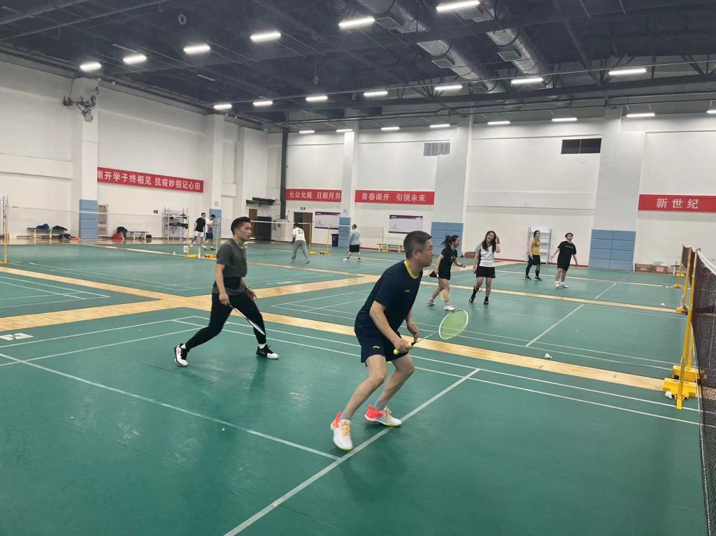 羽毛球馆组织开展了教职工羽毛球比赛,近20位教职工参加了活动。比赛现场气氛热烈,参赛人员在你来我往的博弈中尽情享受着羽毛球的乐趣,现场笑声不断。