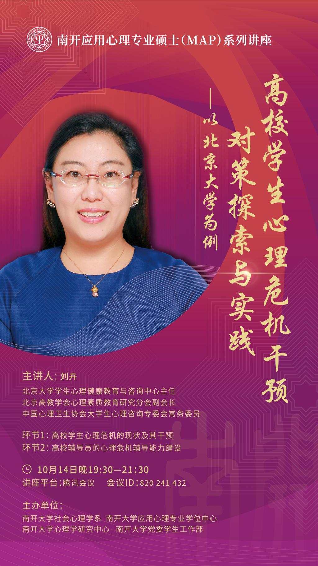主讲人简介:刘卉,北京大学学生心理健康教育与咨询中心主任,北京高教学会心理素质教育研究分会副会长,中国心理卫生协会大学生心理咨询专委会常务委员时间:10月14日晚19:30—21:30腾讯会议地址:820 241 432