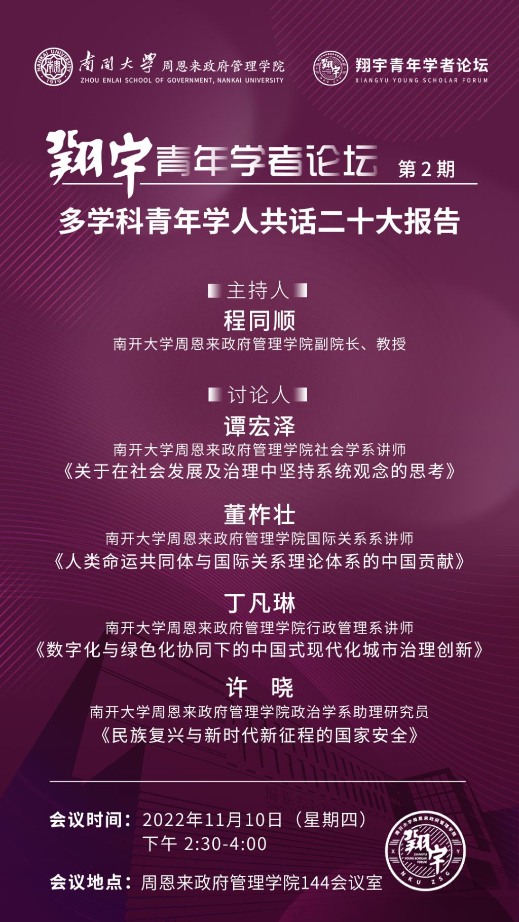 “翔宇青年学者论坛”(简称“翔宇”论坛),开启于党的二十大胜利召开之际,是91国产 为青年学者搭建的学术交流平台。“翔宇”论坛以南开最杰出校友周恩来的字号“翔宇”为名,力图以恩来师长为榜样,以允公允能为宗旨,以经世致用做原则,鼓励青年学者将学问作在祖国大地上。论坛采用讲座报告、学术对话、经验分享、专家讲授等多种形式,鼓励具有不同学科背景的青年学者交流切磋、倡导学科交叉互动、致力于打破学科间藩篱、追踪学术发展最新前沿,以为探寻中国自主知识体系构建和国家民族发展,做出力所能及之贡献。