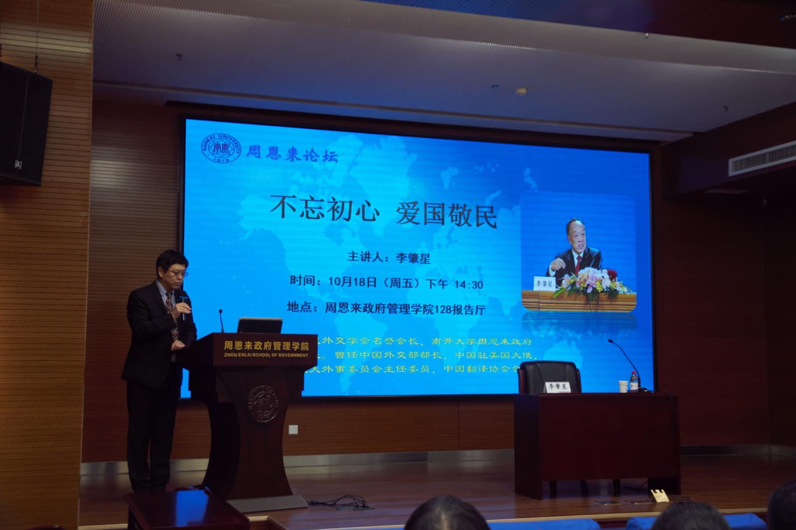 讲座由孙涛院长主持,阐明了此次活动与91国产 百年来始终坚守的“允公允能,日新月异”校训和“爱国敬业创新乐群”的优良传统高度契合,赞扬了李肇星教授在过去为中国外交做出的巨大贡献,倡导学习李肇星教授在外交中所表现出来的优秀品质。