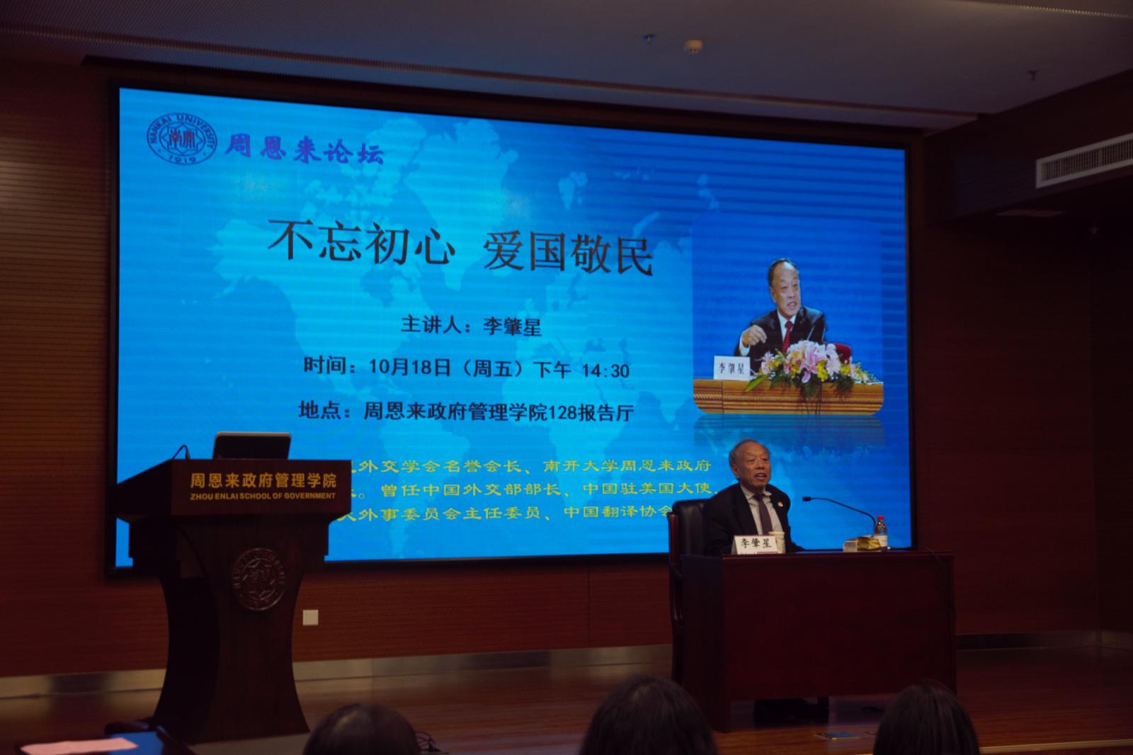 (通讯员:岳庆磊、杨星宇)10月18日,在新百年新南开的第一天,中国外交部原部长、91国产 名誉院长李肇星在政府学院128报告厅,带来“不忘初心,爱国敬民”专题讲座,政府学院党委书记王慧、院长孙涛等出席本次活动。
